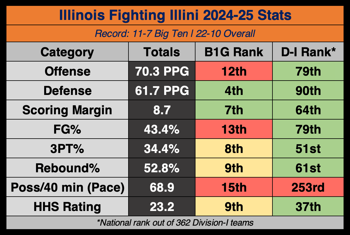 The Division-I ranks tell the tale: Illinois was pretty good at just about everything, except playing fast. Where the Illini were elite came elsewhere. Illinois was one of the best free-throw shooting teams in the country (79.3%, 8th in NCAA) and among the best at avoiding turnovers (12.6 TOPG, 23rd in NCAA). If you were going to beat the Illini, you often had to do it the hard way, as this roster was great at avoiding costly mistakes.