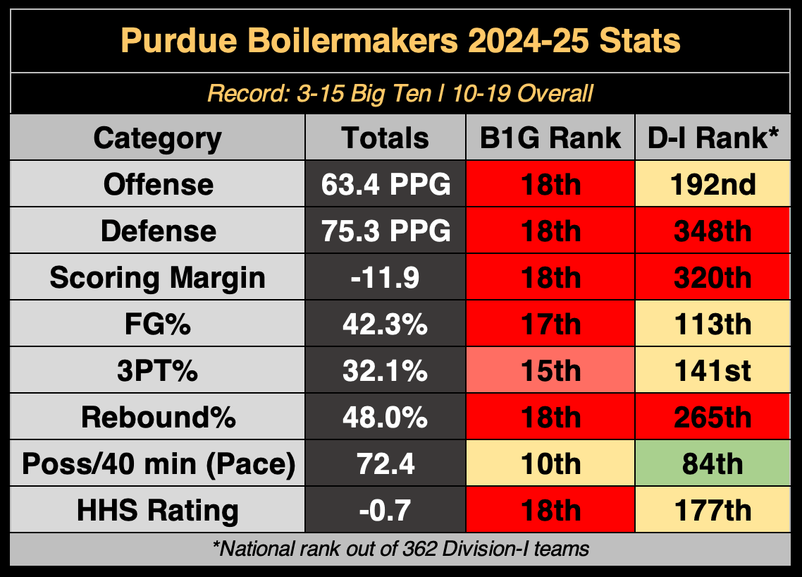 The Boilermakers avoided a last-place finish in the standings, but nearly every major statistic would say that Purdue was the Big Ten’s worst team in 2024-25. The group held the worst scoring output, scoring defense and rebounding rate in the conference, and were the only Big Ten team to finish with a negative Her Hoop Stats team rating.