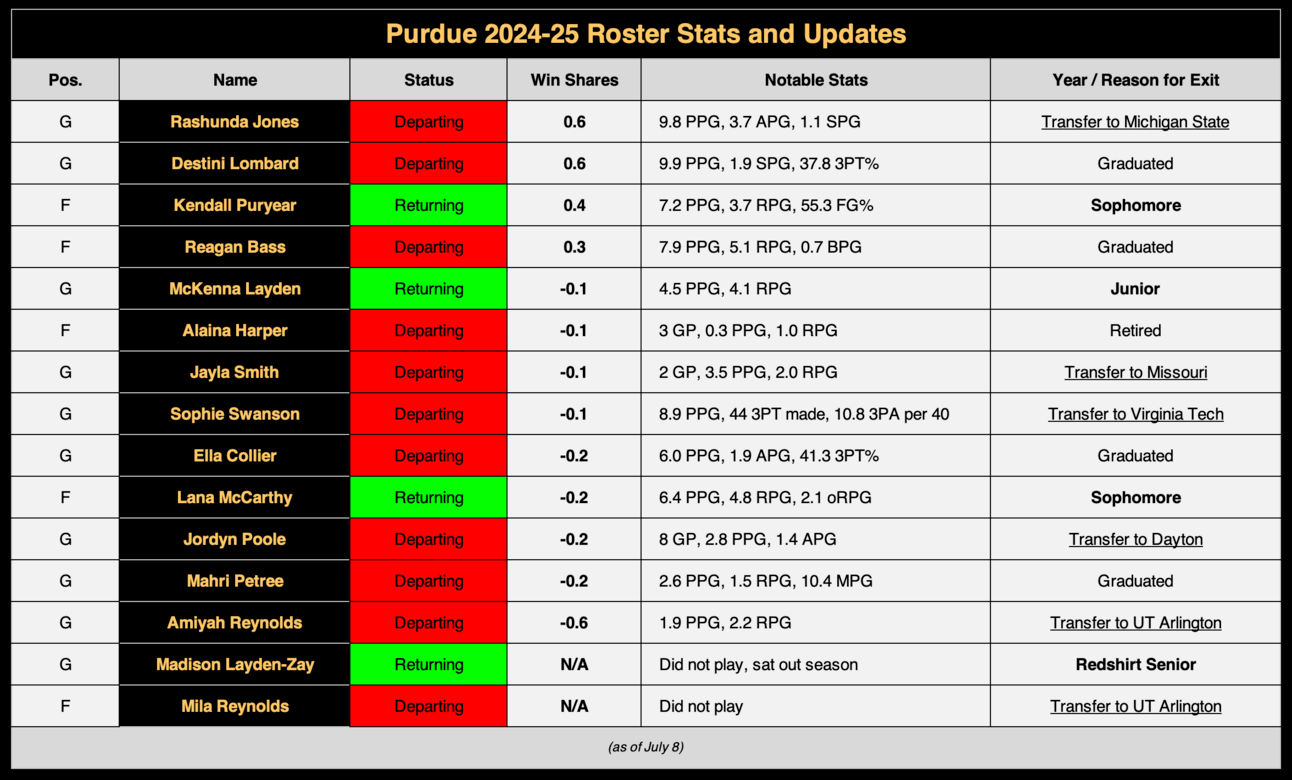 Purdue hit double-digit exits this offseason, with 11 players leaving overall. More concerning, over half (six) of those exits were through the portal, including Rashunda Jones, who had an extremely promising first two seasons and who Purdue will be seeing again as an opponent at Michigan State.