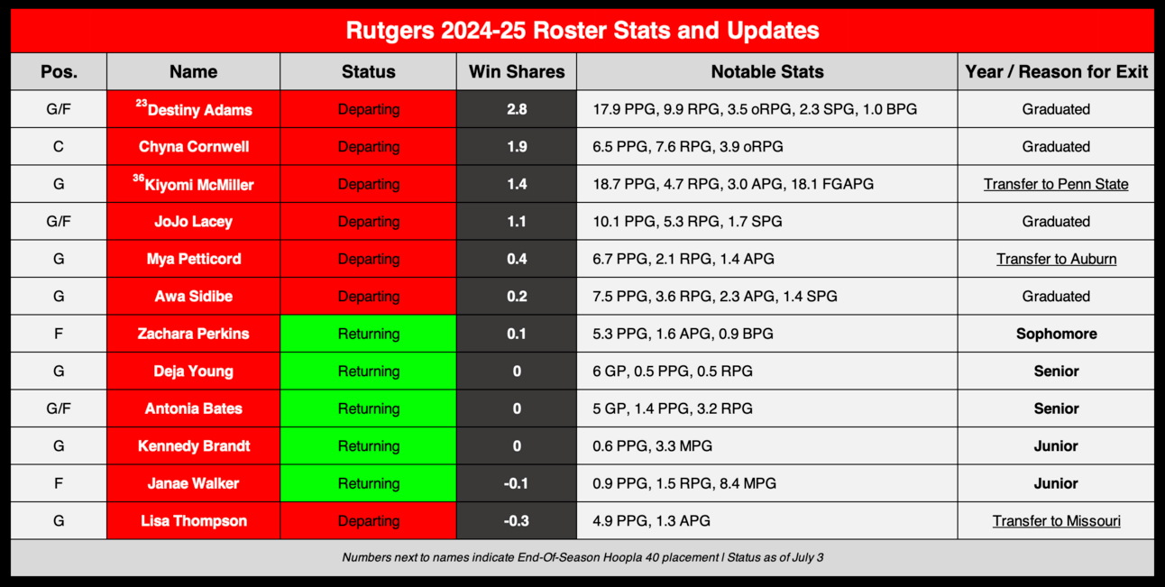 The Scarlet Knights are returning five players from last year’s team whose combined 23-24 win shares come out to 0.0. This includes the bottom four in total minutes played from last season, as well as rising sophomore Zachara Perkins.