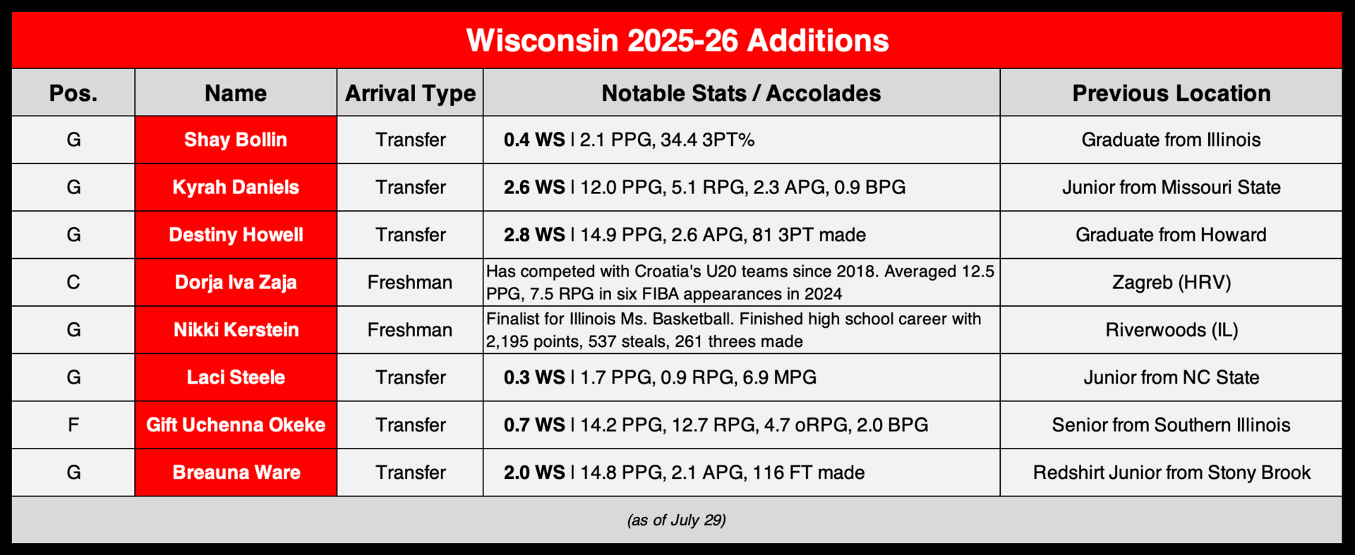 The three graduates of Halle Douglass, Natalie Leuzinger and Tess Myers leaves Wisconsin without some key shooting options, specifically Leuzinger who really found her shot in her final season. Tessa Grady, Gracie Grzesk and D’Yanis Jimenez are the remaining losses, and hurt more for their potential as three more underclassmen (along with McCray) that are out the door with multiple years of eligibility.